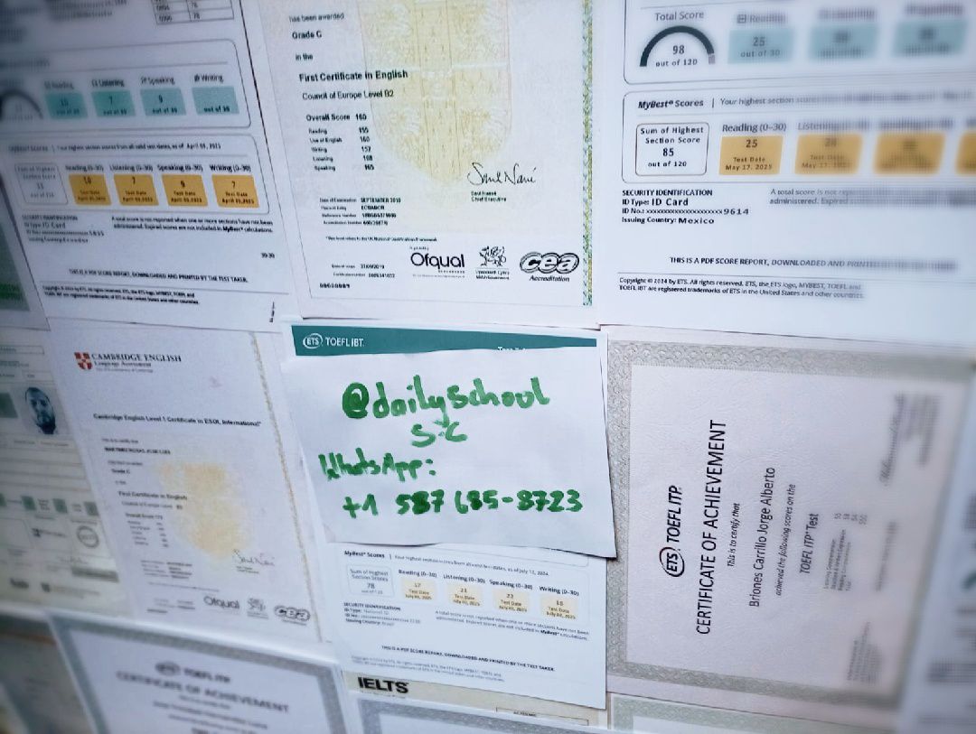 ![]() Our Services We provide Official certificates with registration into the database and actual center stamps for customers interested in obtaining the certificates without taking the test; BUY IELTS,TOEFL,TOEIC, TOEFL iBT: Email: toeflielts55@gmail.com daily_school.sc@yahoo.com |